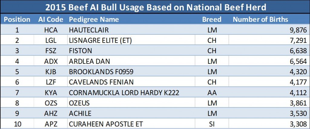 The 2015 Top Beef and Dairy AI bull usage lists have now been released. This list sees a Limousin bull make the top of the Beef list. Hauteclair (HCA) (Pictured Above) had 9,876 calves registered to him in 2015 more than any other bull. ‘Hauteclair’ has a replacement index value of €126 and is 5 star (within the Limousin breed). Charolais sire Lisnagre Elite (ET) (LGL) was second on the list with 7,291 calves registered to him in 2015. ‘Elite’ has a replacement index value of €26 and is 4 star (within the Charolais breed). Charolais sire Fiston (FSZ) was third on the list with 6,638 calves registered to him in 2015. ‘Fiston’ has a replacement index value €91 and is 5 star (within the Charolais breed).