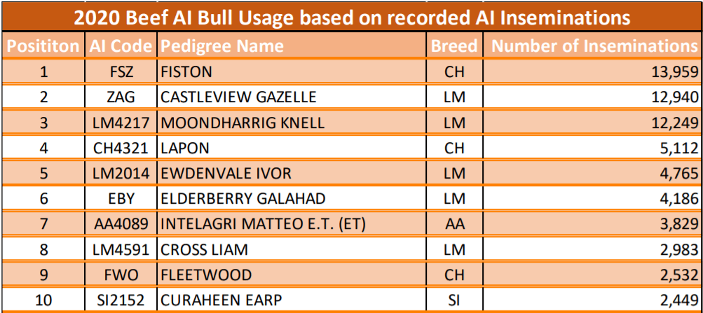 With the 2021 breeding season well underway, now is a good time to look back at the previous breeding season. Below, we display the top 50 Beef AI bulls used on Beef Cows in 2020 based on the data recorded on the ICBF database.