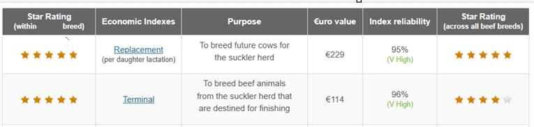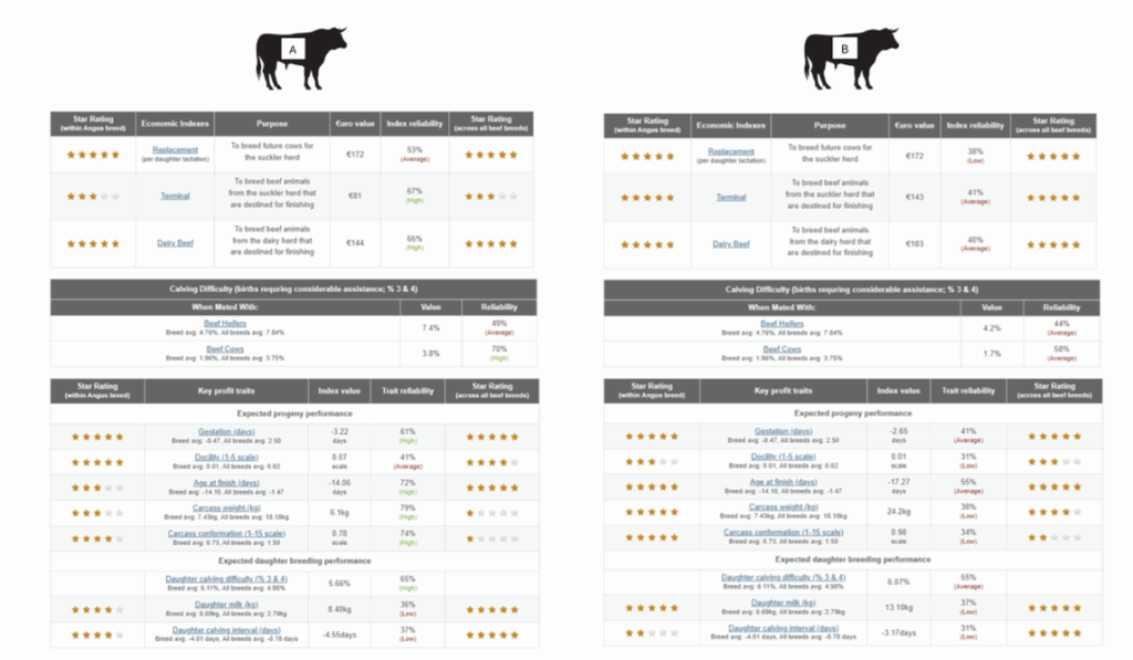 Farmers should look at the within breed stars or across breed stars as well as the individual traits of importance for their herd. Within breed stars rank an animal against other animals of the same breed, while across breed stars rank an animal against other animals across all beef breeds. It is important to look at the individual traits that make up an animal’s overall index, such as carcass weight or daughter calving interval.