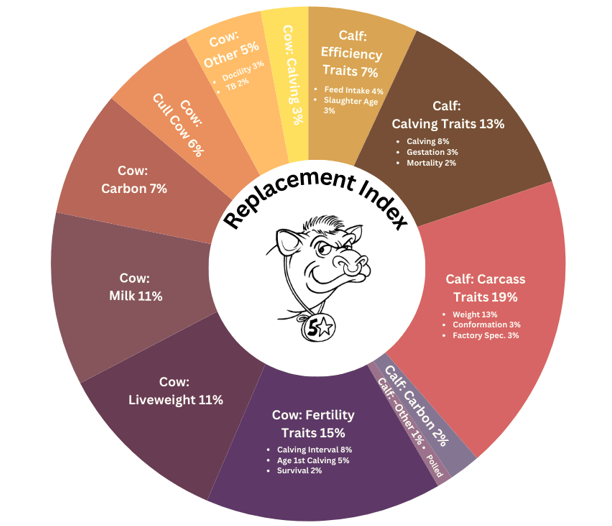 The Replacement Index looks at the maternal traits such as milk and fertility, whilst maintaining the traits needed to produce weanlings. Suckler farmers aiming to breed replacement heifers should focus on the Replacement Index. Calf traits account for 41% of the overall Replacement Index while the cow’s traits contribute to 59% of the index.