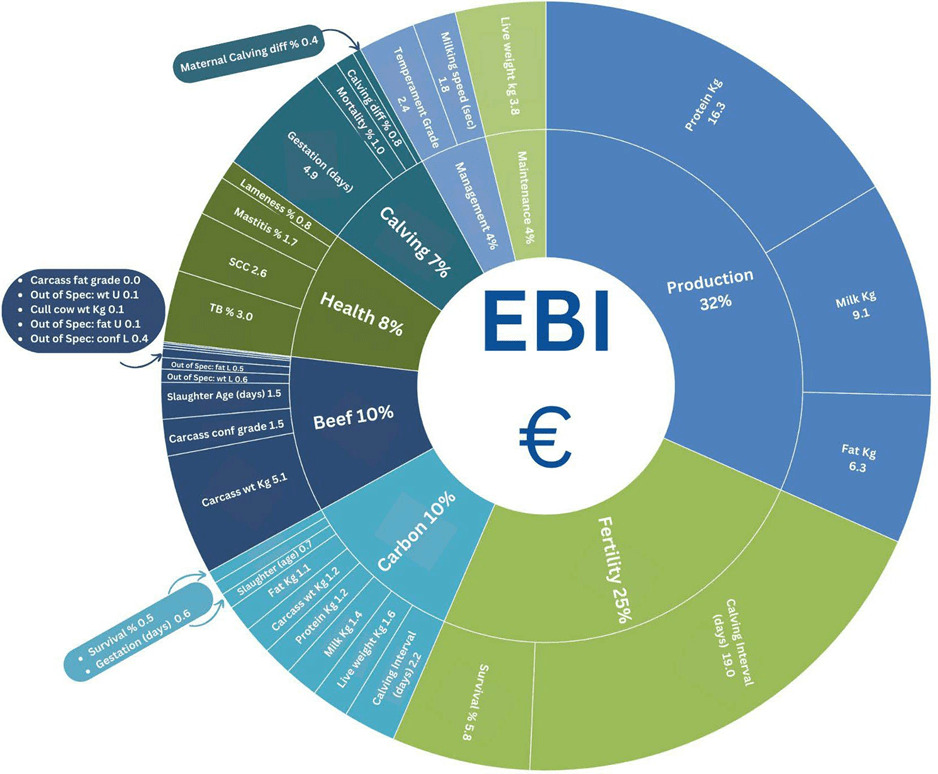EBI is a single figure profit index aimed at helping farmers identify the most profitable bulls and cows for breeding dairy herd replacements. It comprises of information on eight sub-indexes related to profitable milk production. These are; (1) Milk Production, (2) Fertility, (3) Calving Performance, (4) Beef Carcass (5) Carbon, Cow Maintenance (6) Health, (7) Maintenance and (8) Management. A summary of the sub-indexes, including traits and relative weightings for traits in the EBI is displayed in Chart 1, e.g. Fertility has a 25% weighting in the EBI. Economic values in the index are based on data collected from Irish Dairy Farms and the Dairy Industry. These values were last updated in November 2022.