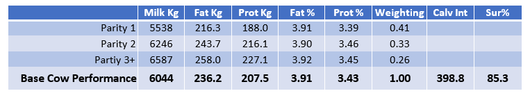 Does this mean the offspring, assuming a heifer, will milk 400Kg more than the “base cow” (i.e. 6044kg + 400kg = 6444kg)? The answer always depends on the level of management – the heifer will be genetically capable of milking 400kg more than the base cow but how much she physically outperforms the base cow will be dependent on the management of the animal. In a higher input environment, she could perform much more than this or in a lower input environment it may be less than this.