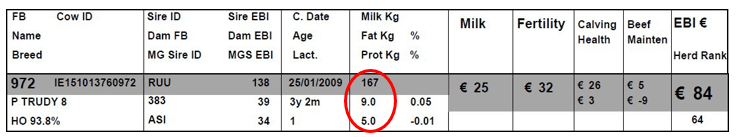 Cow 972 (Fig 1. below) has a Milk kg PTA of +167kg which means that she would be expected to produce 334 kg more milk than the base cow (167kg x 2 = 334kg). If she is mated to a bull with a Milk kg of +233kg the resultant offspring will have a potential for milk (i.e. Breeding Value) of +400kg.