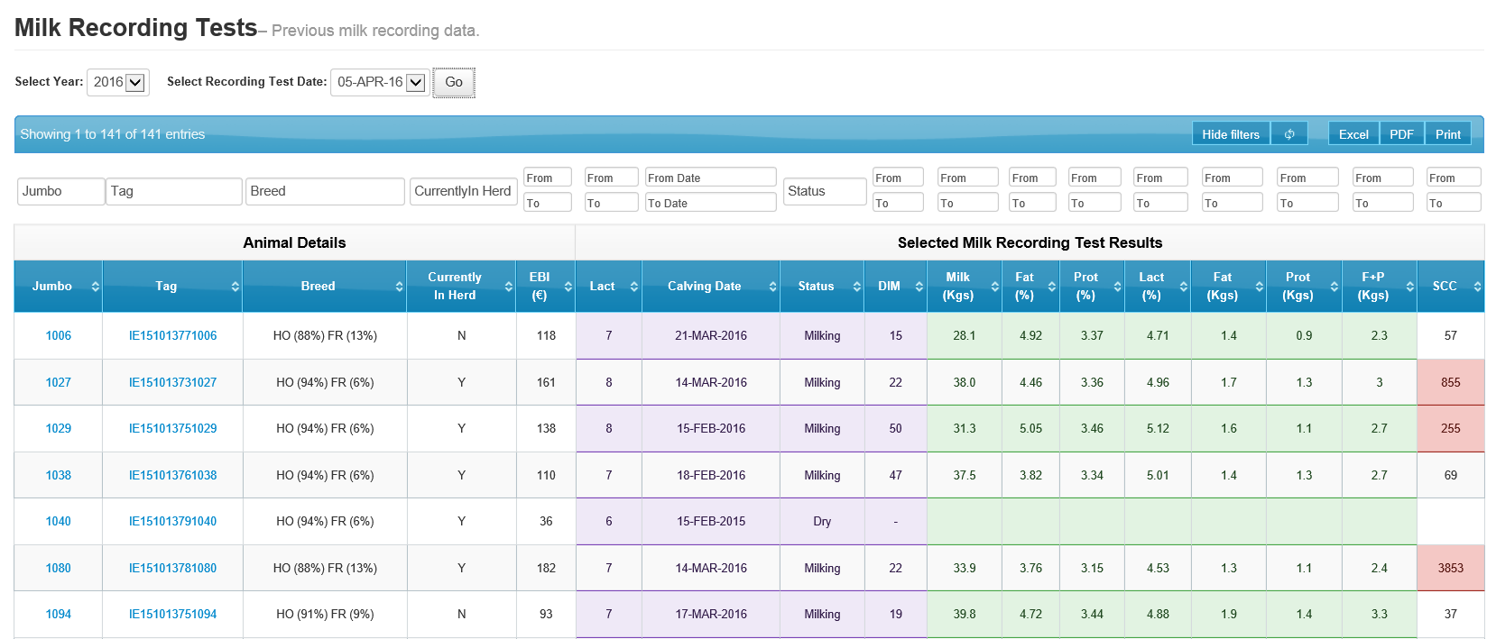 Before the advent of this screen, past milk recordings were only available in PDF format. The benefit of the profile format is that it allows the user to select a particular year of milk recording and also a particular test date. This will allow the user to analyse the results of a specific milk recording test. Some useful benefits to the farmer when using this screen include: