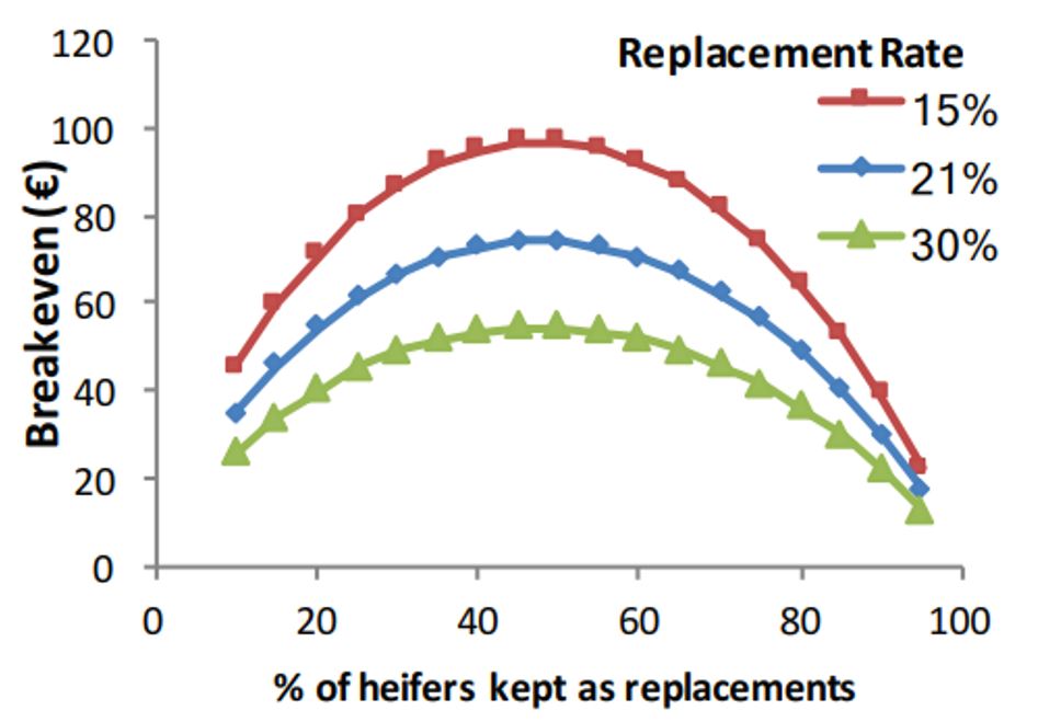 The current cost of genotyping all female calves in a herd is €22/head (incl. VAT). This is considerably cheaper than overseas, where genotyping costs range from €31 – €90. The cost of genotyping female dairy calves can be recouped through better selection of herd replacements. This is illustrated in the Figure 1, where the breakeven genotyping cost at a 21% replacement rate assuming 80% of females genotyped are retained is €49, more than double the actual cost. For example, a herd that keeps 80% of heifer calves as replacements and has a replacement rate of 21% has an expected net benefit of genotyping of €33 per heifer retained. Genomic information can also be used to confirm parentage, identify lethal/major genes, estimate inbreeding and predict the breed composition of an animal.