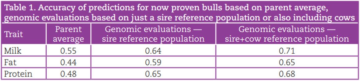 The first step in genomic selection is to establish a reference population. The reference population is a large genotyped population of animals with accurate performance information such as milk yield or fertility. The associations between the DNA and performance measures are then derived from this population. Several thousand animals are required to form a good reference population; presently there are over 8,000 informative animals within the Irish Holstein-Friesian reference population. Increasing the size of the reference population is essential to ensure genomic prediction estimates are accurate. The average reliability of genomic proofs of young animals is now 63%. A recent validation exercise revealed the accuracy of genomic evaluations is 16%-35% more accurate than evaluations based solely on parental average. New research clearly shows that there is a further benefit if genotyped cows are also included in the reference population; the accuracy improves a further 5–10% over just using information on sires (Table 1).