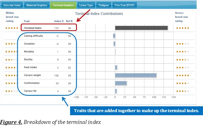 A. The terminal index is made up of the traits that are important to farmers that are breeding cattle for slaughter, or sale as weanlings/store cattle. Traits such as calving difficulty, feed intake and carcass weight are taken into account when generating an animal’s terminal index. The full makeup of an animal’s terminal index is outlined below: This can be accessed by clicking on “Terminal Graphics” on the online bull search (See figure 4).