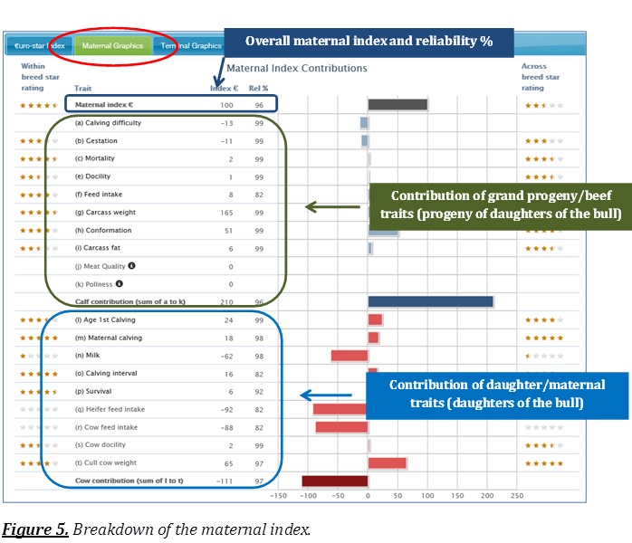 As well as being strong on maternal traits such as milk, the daughters of a bull must be able to pass on strong beef genetics to their calves in order for them to make maximum use of the milk that they are consuming. A good way to explain this is to compare a beef suckler cow to a dairy milking cow. If suckler farmers used dairy bred females such as Holstein/Friesians or Jerseys as suckler cows, then they would be guaranteed an abundance of milk. However, these cows would pass on very poor beef traits to their calves and even though they would have access to a lot of milk, these calves would not possess the genetics to perform because of the influence of their dairy bred mothers. It is important to remember that half of the genetic makeup of any calf comes from the dam (mother), which means a good quality bull will not guarantee a good calf if the females he is being mated to have poor beef genetics. The full makeup of a bull’s maternal index is outlined below. This can be accessed through the online bull search by clicking on “Maternal Graphics” (See figure 5)