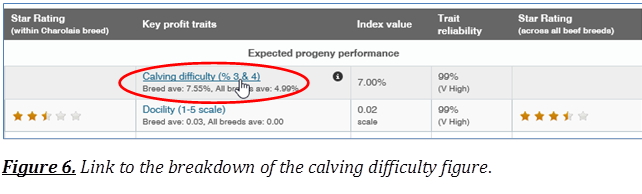 A. You can access the breakdown of a bull’s calving difficulty figure through the online bull search. When you are looking at the online index (Euro-Star ratings) of a bull you can click on “Calving difficulty (% 3 & 4)” (See figure 6).