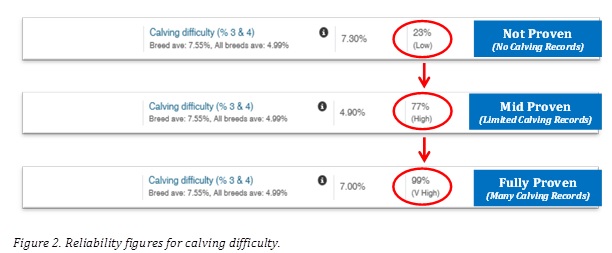 A. Naturally, farmers desire ease of calving when it comes to heifers. Bulls with a low reliability figure for calving difficulty (less than 50%) will have few if any calving ease scores recorded on them, therefore there is a certain amount of risk if using such bulls on heifers. Ideally farmers should only use proven easy calving bulls on heifers, but sometimes this is not possible, particularly if a young stock bull is being used. If a farmer uses AI, then it is best to use bulls with a low calving difficulty figure (less than 5%) with a high reliability figure (greater than 90%). If a farmer buys a new stock bull, then if possible, avoiding using him on heifers for the first year would be good practise. By doing this a farmer can judge the calving difficulty of the bull on his cows before deciding whether or not to use him on heifers.