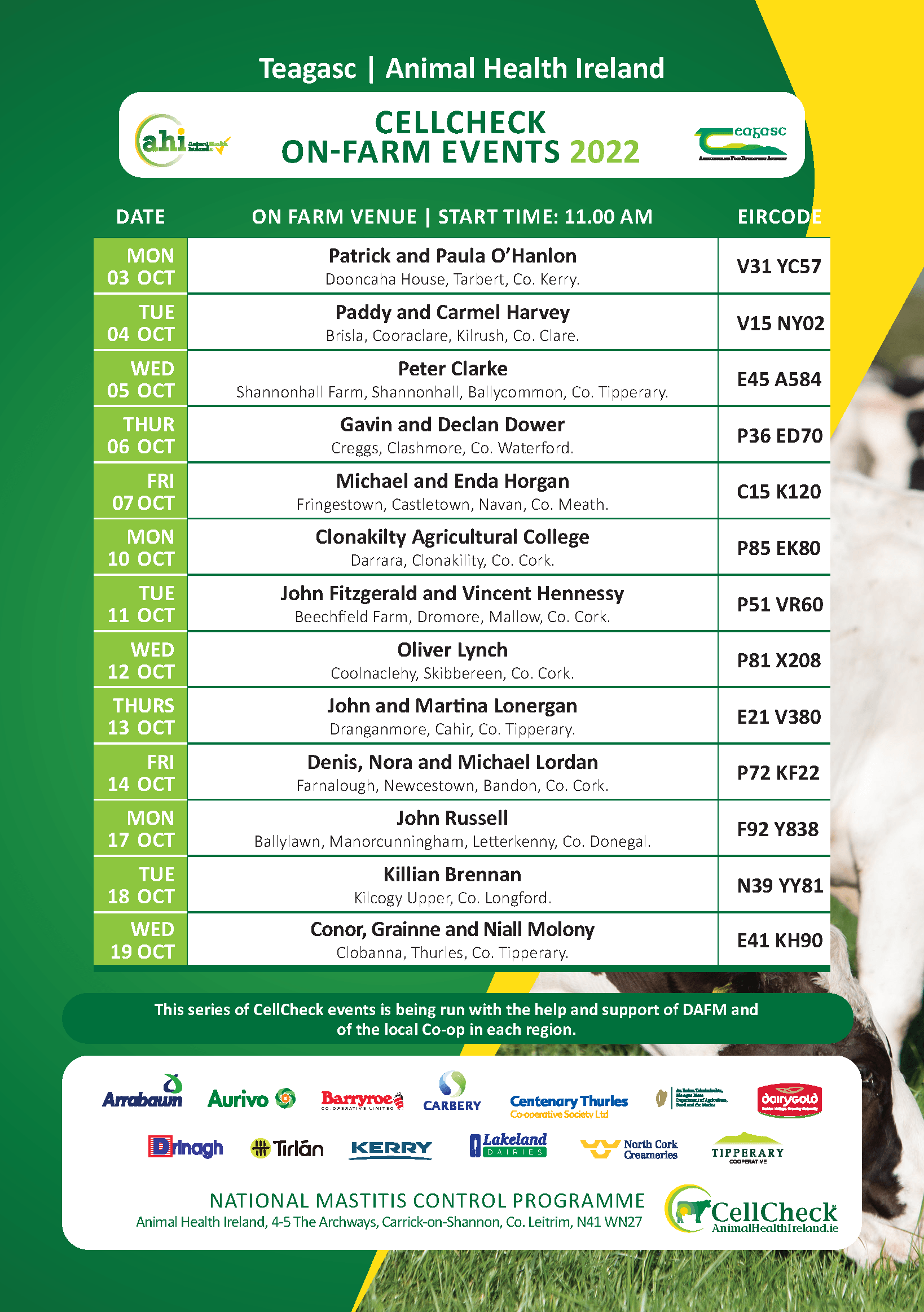 Animal Health Ireland in partnership with Teagasc and in conjunction with the dairy processors and the Department of Agriculture, Food and the Marine are running a series of on-farm events in October.