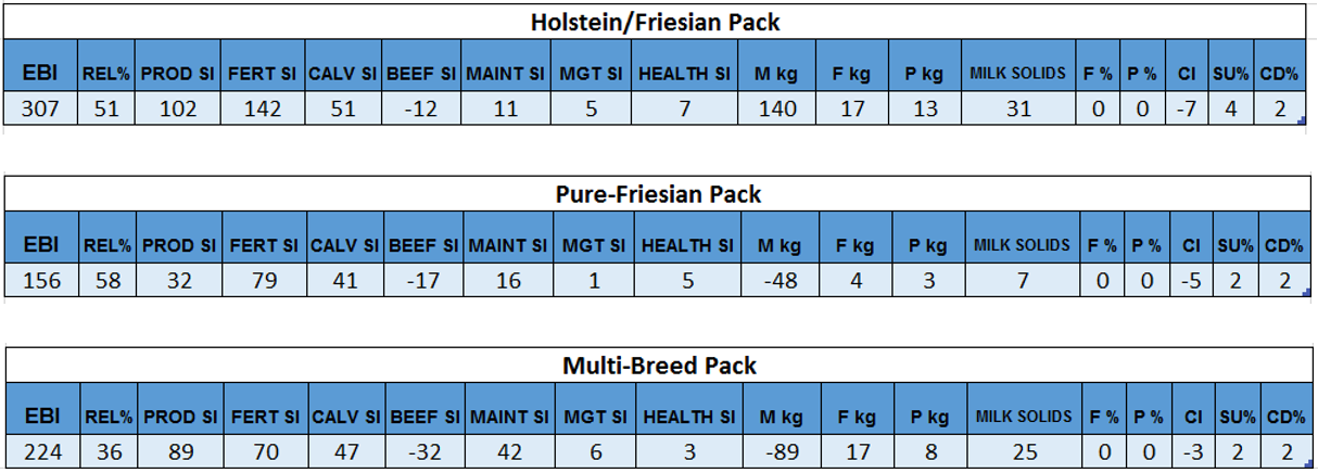 The breed packs and the EBI details available this year are as follows: