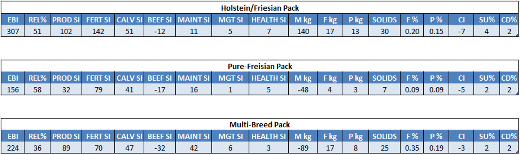 *The Multi-breed pack is a combination of Jerseys, HF x JE crossbreds, Norwegian and HF bulls for comparative purposes.