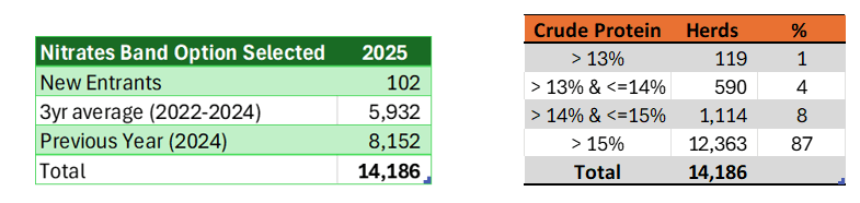 The tables below show how dairy farmers submitted their nitrates banding details in 2025, including the band options chosen and the crude protein percentages selected.