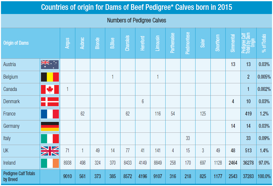 - Not surprisingly, 97% of all the dams of pedigree beef calves born in 2015 are Irish.