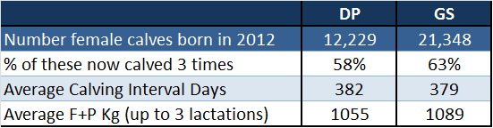 The second aspect of the analysis undertaken by ICBF and Teagasc was to establish what difference (if any) existed between the progeny of the high EBI GS bulls compared to the high EBI DP bulls, based on performance of their progeny on commercial dairy farms. The analysis was based on 33,577 females calves born during 2012 from the 14 AI bulls identified in Table 1 above.