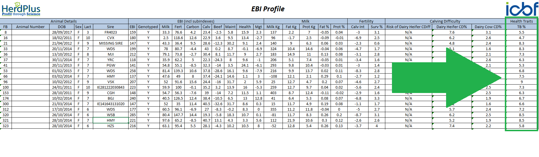 Step 4: Check the last column ‘Health Traits‘ to view the breeding value for TB on the animals in your herd.