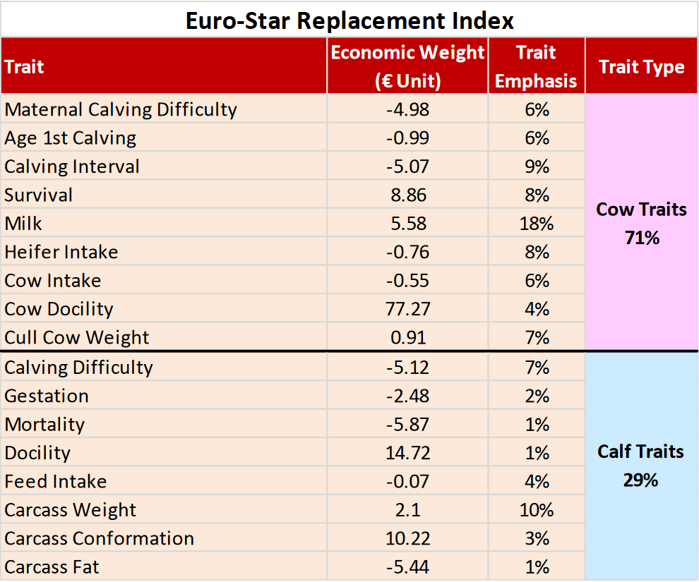 The Euro-Star Index has two overall indexes – the Replacement Index and the Terminal Index. This is to facilitate the use of Euro-Star Indexes across different farming systems. Some farmers may breed their own replacements, in which case the Replacement Index is most relevant. Other farmers may sell all of their suckler progeny as weanlings or take them through to slaughter, in which case the Terminal Index is most relevant.