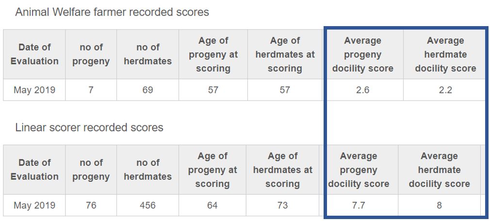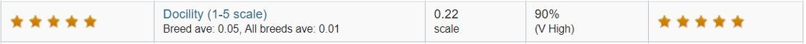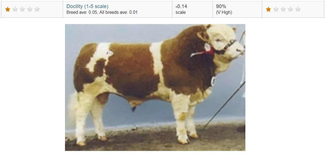 Putting these 4 pieces of information together results in ‘Omorga Prince’ being rated as a 1 star bull for docility with a 90% reliability rating.