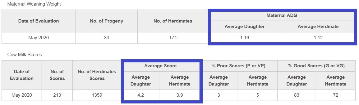- Scroll down to the 2 tables that say, ‘Maternal Weaning Weight’ and ‘Cow Milk scores’.