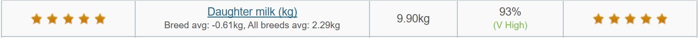 Putting all these pieces of information together results in ‘Bavardage’ being rated as a 5-star bull for ’milk’ in Ireland with a 93% reliability rating.