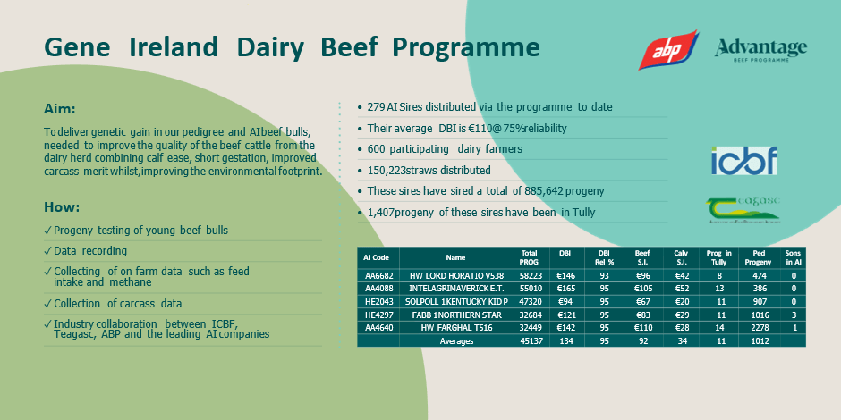 The Gene Ireland Dairy Beef Programme is a nationally coordinated initiative designed to provide dairy farmers with access to high-quality beef genetics. Launched in 2015, with the goal of enhancing the profitability of beef produced from the dairy herd, the programme enables the use of elite beef bulls in dairy herds through a structured progeny testing approach. This means that beef bulls are assessed based on the performance of their progeny, ensuring that only the most suitable genetics are promoted for further widespread use.