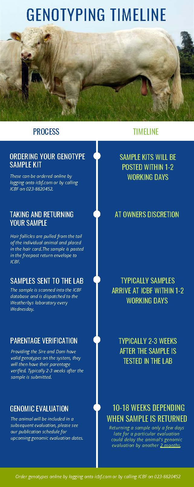 It can take anywhere from 10-18 weeks for a bull to receive a genomic evaluation from the time of ordering a sample kit. If you have a pedigree bull aimed at the autumn sales, it is likely that you will be required to get him genotyped. Hitting the genotyping deadlines is essential to make sure your bull has his parentage verified and a genomic evaluation in time. If a deadline is missed by just one day, the genomic result could take 2 months longer.