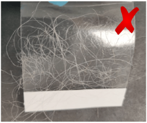Figure (3) hair sample is unsuitable for genomic testing. Hairs are damp and contaminated with dirt and mould.