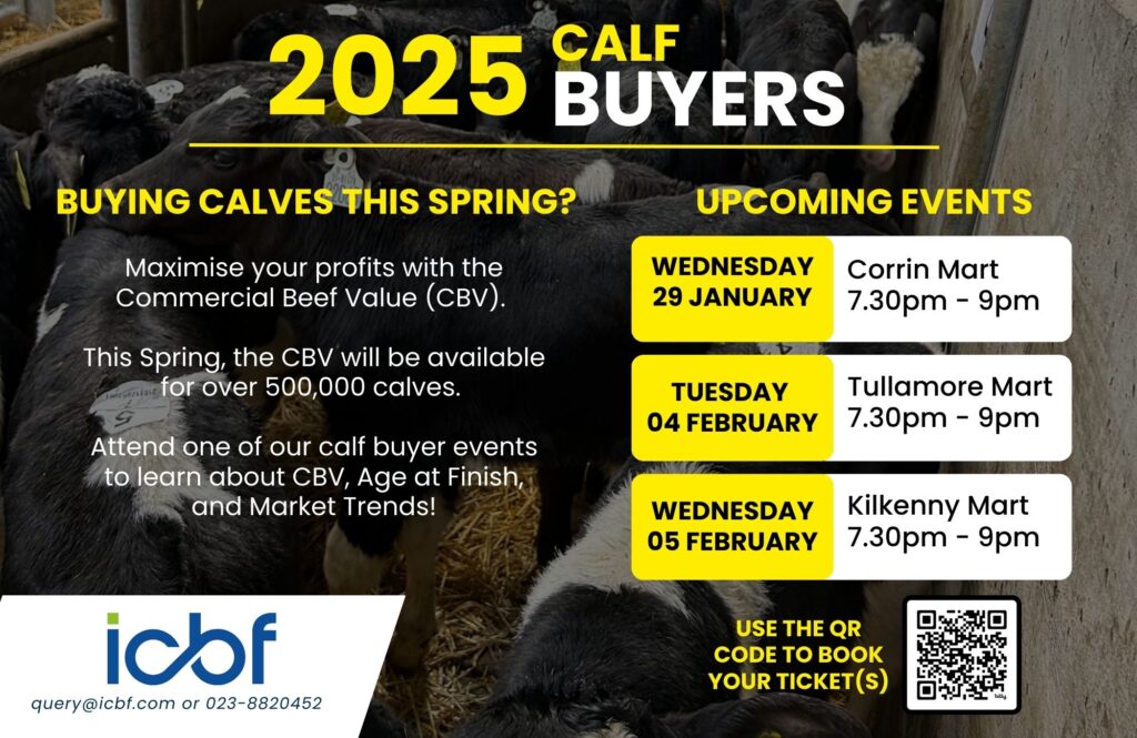 Post published:21/01/2025 Post category:News Speakers from ICBF, Teagasc and Bord Bia will go through a variety of topics to better equip farmers with information to aid in decision making and future profitability. Book your ticket(s) using the buttons below: Corrin Mart – 29th Jan Tullamore Mart – 04th Feb Kilkenny Mart – 05th Feb Read more articles Previous PostNGP: How to Register calves on Agfood.ie Next PostCharlie Smyth’s Success with the Commercial Beef Value (CBV)