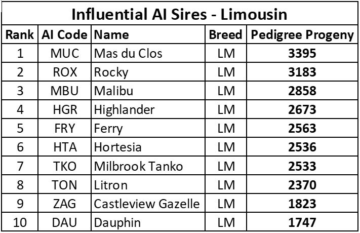 Post published:15/07/2019 Post category:News The following is a list of the 10 AI Sires with the most number of total pedigree registered progeny in Ireland for the ‘Limousin’ breed. MUC HGR TON DAU Read more articles Previous PostFBD Euro-Star €200 Beef Farm Walk Next PostAdvancements in genomic evaluations