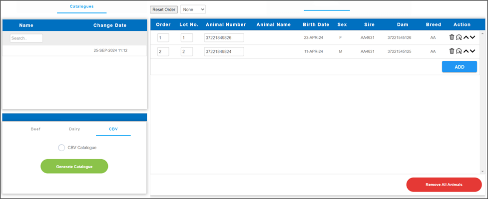 Farmers can generate a catalogue through their HerdPlus accounts. Once logged in, go to the “Applications” dropdown at the top of the screen and select “Sales Catalogue”. This will take you to a screen with a listing of all the animals in your herd. Select the animals you want included in the catalogue and click “Continue” at the top right of the screen. The next screen is the same as figure 3 below. The selected animals will already be listed on the right. Select the CBV option in the lower left and click “Generate Catalogue”. This will generate a PDF of your catalogue.
