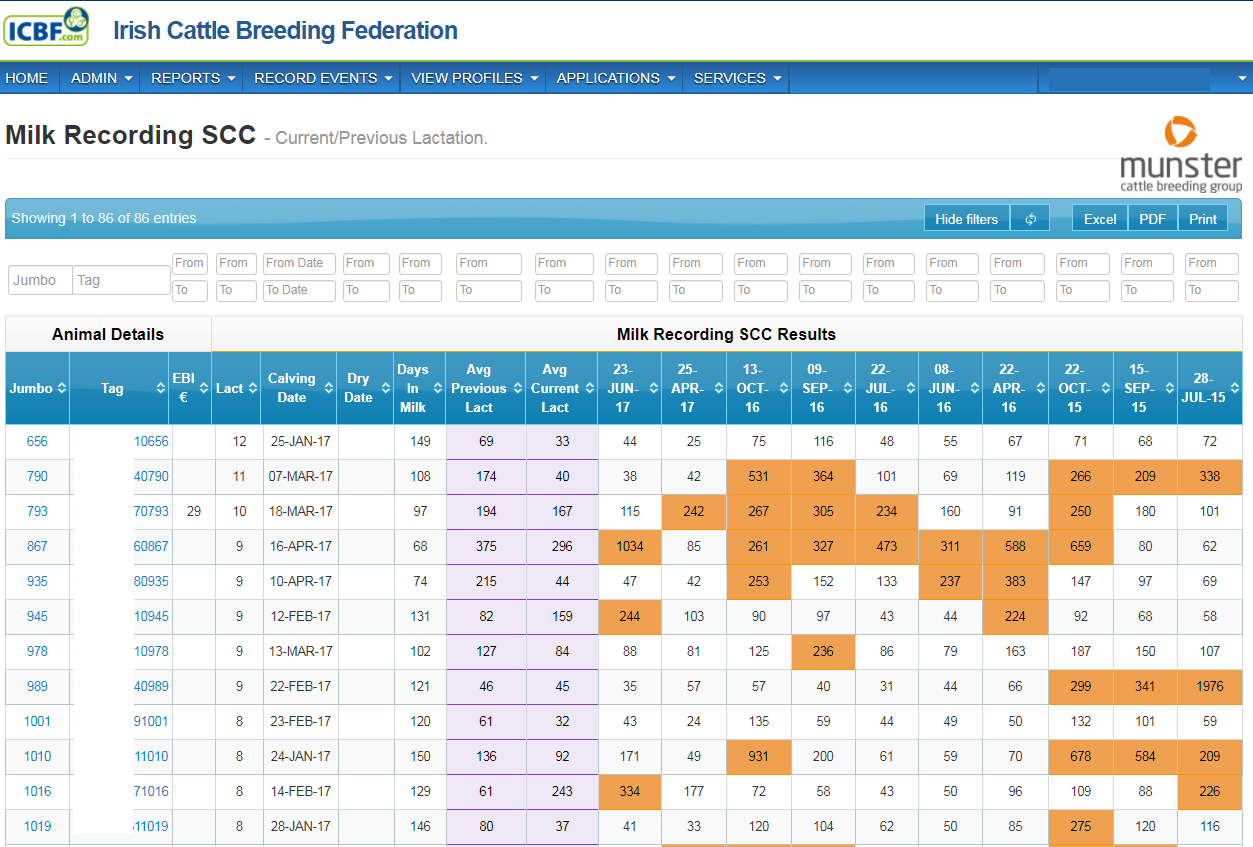 - Cows with a SCC result of greater than 200,000 are highlighted in orange. This allows farmers to identify “problem cows” for treatment and/or potential early dry off. It will also help to identify trends in SCC.