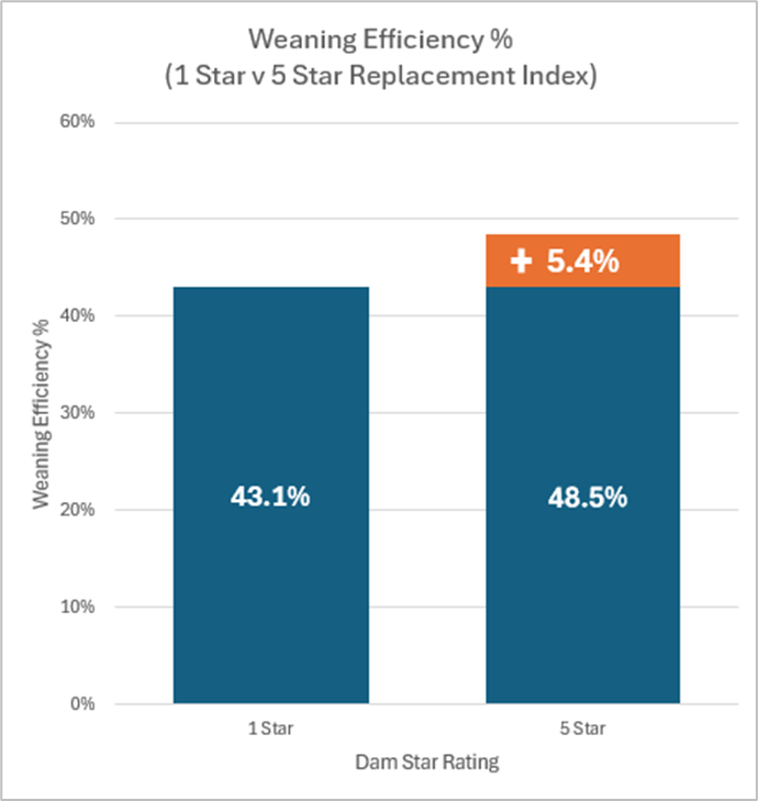 The Weaning Efficiency % is calculated by dividing the calf weight by the cow weight (325/670 = 48.5%). 5-star cows were 50kg lighter, weaned calves 15kg heavier, resulting in a 5.4% higher Weaning Efficiency % (figure 1).