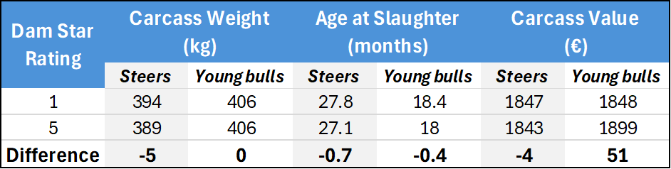 To get a more complete picture of progeny performance, we also looked at the progeny slaughter data. Table 2 outlines the slaughter performance of both steers and young bulls. Progeny of 5-star cows slaughtered as steers were 5kg lighter at slaughter, leaving €4 less/carcass, however, they were slaughtered 21 days younger (0.7 months) when compared to progeny of 1-star cows. On the young bull data, carcass weights were the same, but progeny from 5-star cows were slaughtered 12 days younger (0.4 months). Young bull progeny from 5-star cows also left €51 more at slaughter.