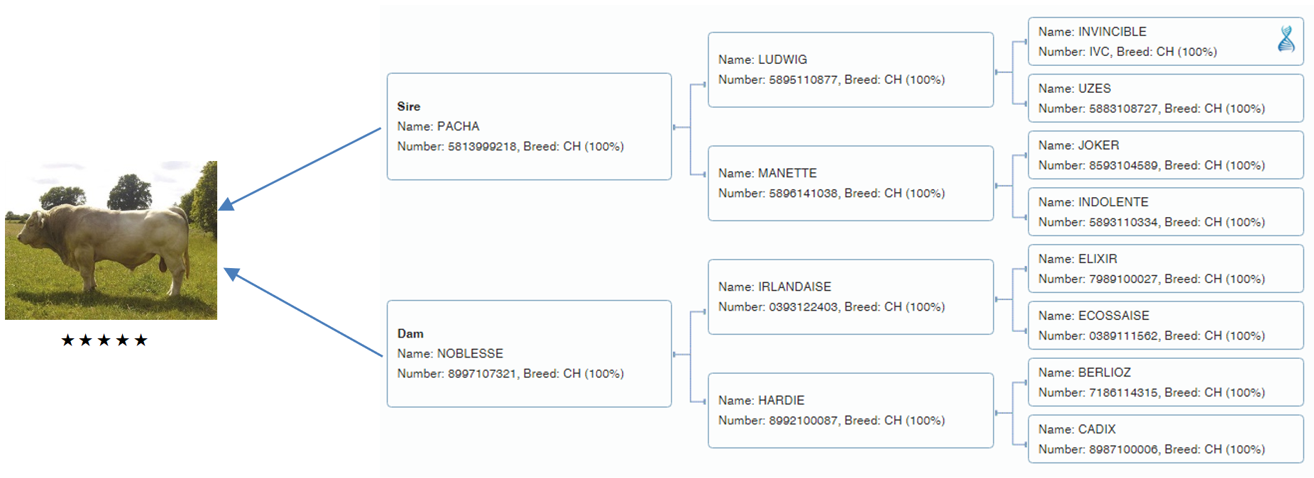 This ‘Parent Average’ calculation is dependant on how much or little we know about the bull’s various ancestors. For example, this bull’s ancestors appear in the backpedigree of other Irish Charolais animals. All of these connections contribute to ‘Bourgogne’s’ first index. It is our first best shot at where his index should start, based on what star ratings his ancestor’s have.