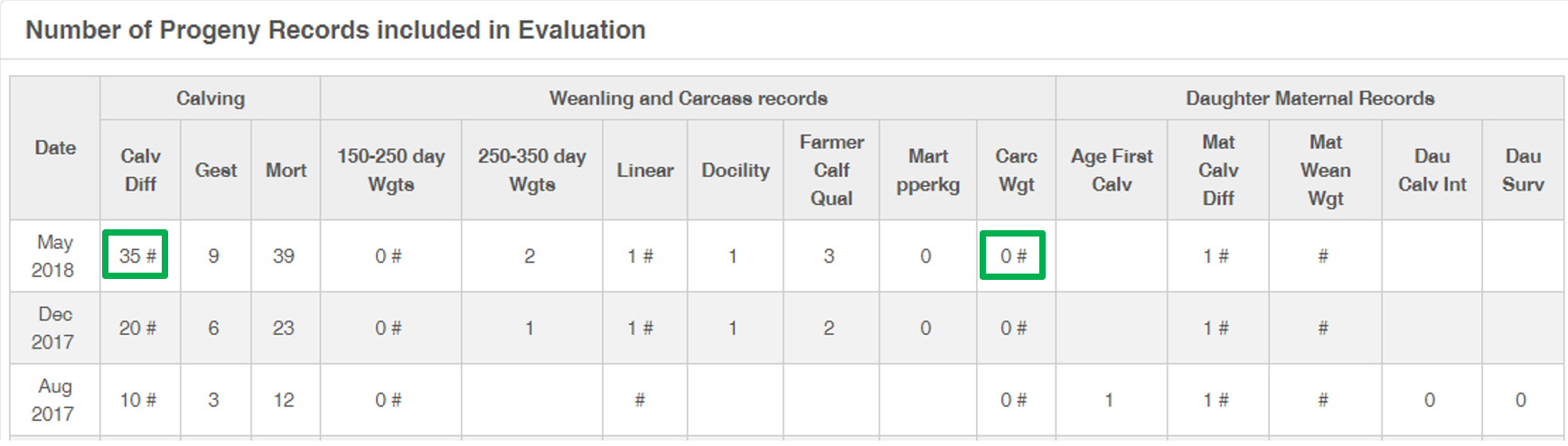 Watch out for the ‘#’!. Bourgogne’ had already been used in France before his semen arrived in Ireland. So ICBF blends in what French breeders have already recorded on his progeny in France, into his Irish €uro-Stars here. It is only possible to do this for traits that are recorded in both countries. ICBF indicates what traits are using such foreign data by placing a ‘#’ sign beside the numbers of records. This table can be found by clicking on the ‘Evaluation History’ tab in the ICBF ‘Animal Search’ results page and scrolling down to the bottom.