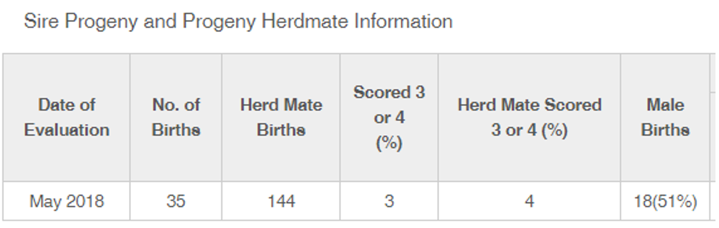 ICBF reflects this on-farm finding in his ‘calving difficulty %’ evaluation by reducing it from 5.40% to 5.20%. There were only 20 records in the previous evaluation run which had him at 5.4%. The increase of 15 records is reflected in his ‘reliability %’ increasing from 69% to 72%. ICBF repeats this same comparison of progeny v herdmates for all the traits 3 times per year.