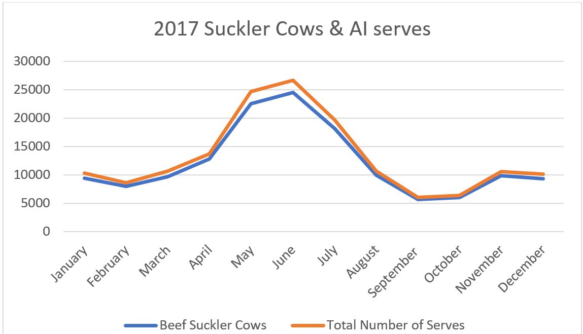 ICBF has recently undertaken analysis for AI service trends for the past 2 years in the beef suckler herd. Overall AI usage has decreased nationally by 6% from 2017-2018 . This correlates with the reduction of suckler cow numbers that has also taken place during the same period.