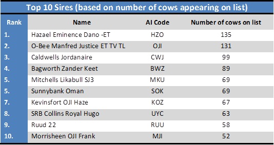 The sires most prominent on the list include Hazael Eminence Dano-ET (HZO) with 135 daughters. O-BEE MANFRED JUSTICE ET TV TL (OJI) with 131 daughters and Caldwells JORDANAIRE (CWJ) with 99. The top 10 represented sires are shown in the table below.