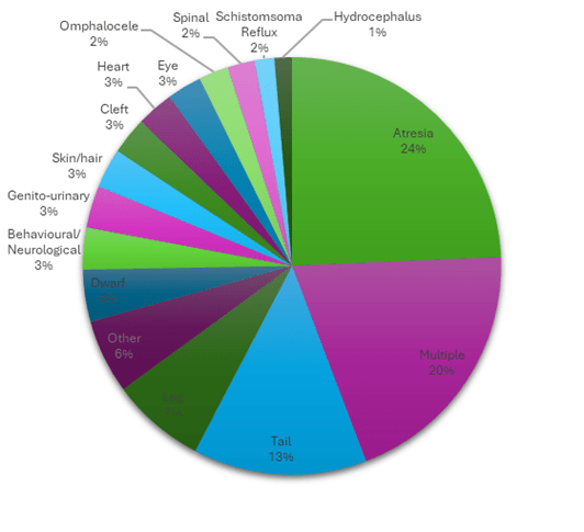 The ICBF/Teagasc congenital defect survey continues to collect valuable data regarding the incidence of abnormalities in calves at birth. An analysis of over 500 reports submitted by survey participants over a 10 year period, indicated that the most commonly reported defect was intestinal atresia (water-belly) (24.3%), followed by multiple defects (at least two defects in the same animal) (19.9%), and tail abnormalities (13.4%).’ Atresia has consistently been reported as a frequent defect in Irish cattle. The analysis indicated that the majority of calves with atresia were male (66%), consistent with previous Irish studies. This study also found that 3.5% of atresia cases were reported as a twin and in 13.6% of atretic calves, a co-defect was reported, most commonly a tail defect. More information can be found here (page 274-275): https://teagasc.ie/wp-content/uploads/uploads/One-Health-One-Welfare.pdf