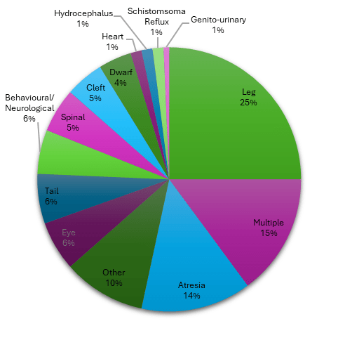 The routine recording of congenital defects by veterinary practitioners, pathologists, farmers and researchers is a collective approach that can be taken to identify abnormal phenotypes, provide improved estimates of their prevalence and contribute to research on possible genetic solutions. Thanks to all farmers and veterinarians who take the time to participate in this ongoing survey.