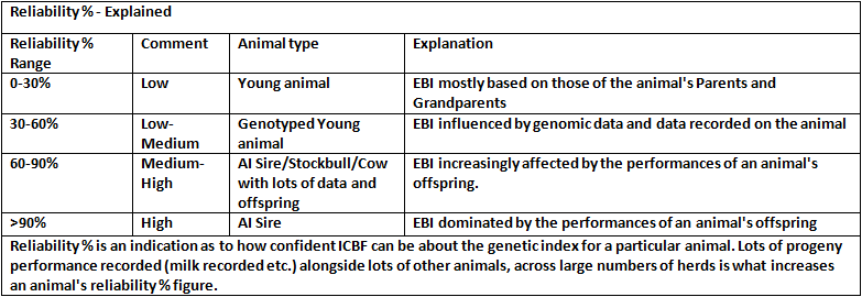Different animals will fall into different reliability ranges depending on the levels of data available for that animal (own performance, ancestry and progeny). The table below gives an explanation of which animals are likely to fall into each reliability % range.