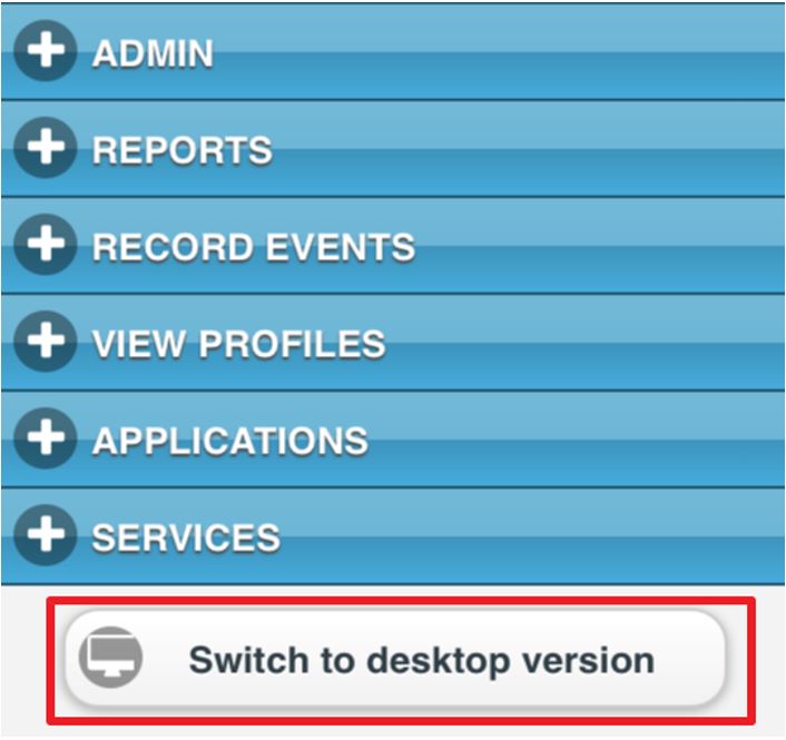 Highlighted in red below are the areas that require the user to ‘Switch to desktop version’ if logged in from smartphone or tablet device.